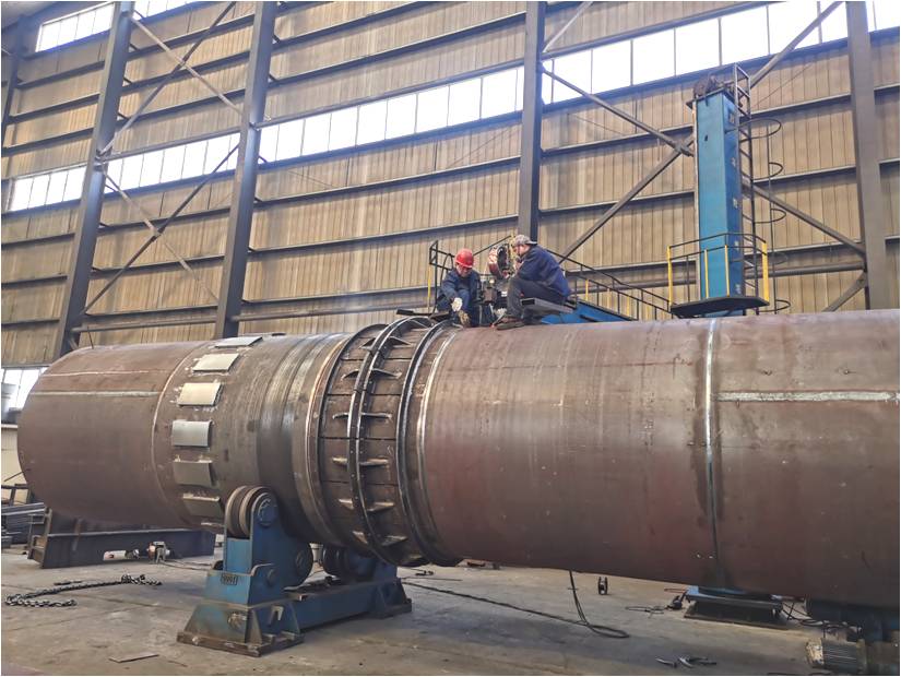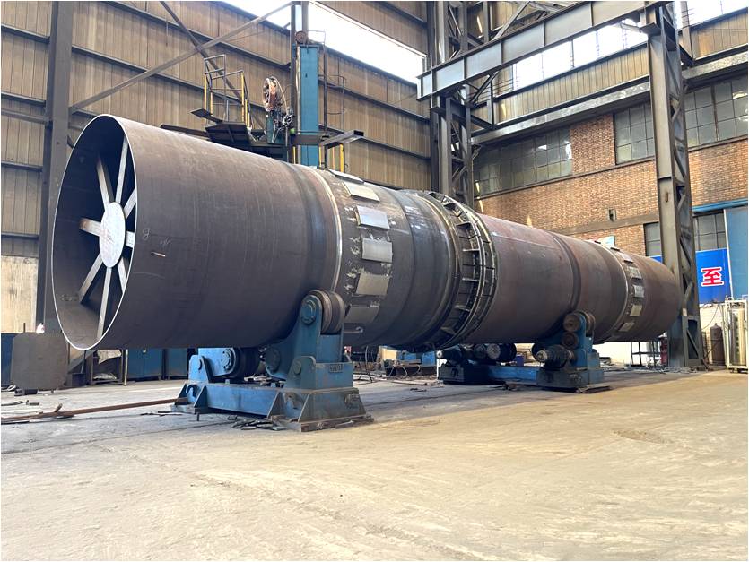 公司重點(diǎn)項(xiàng)目φ2.336×14m冷卻機(jī)筒體在成套廠鉚焊車間快速推進(jìn),組對交檢合格后進(jìn)入下道涂裝工序。